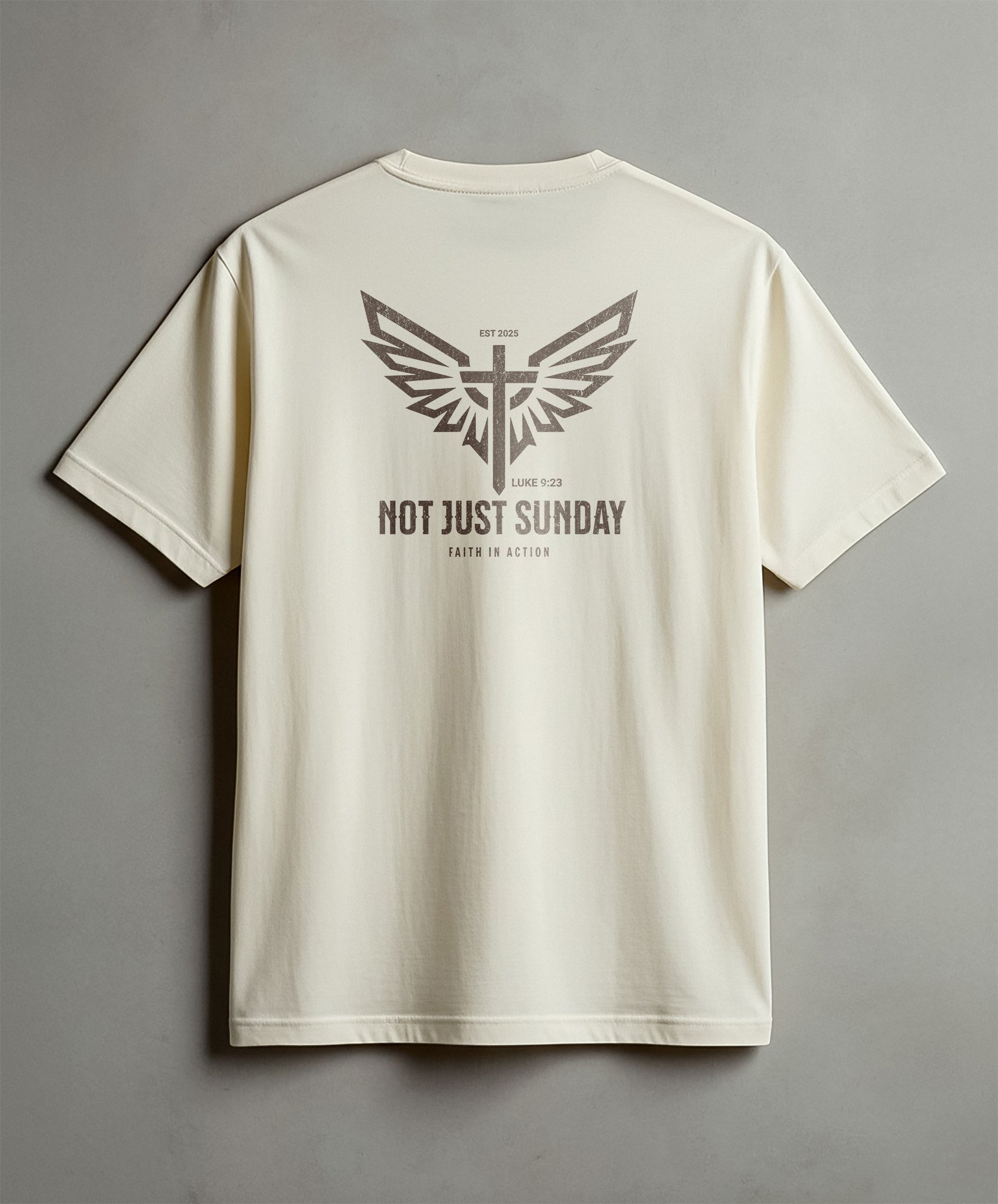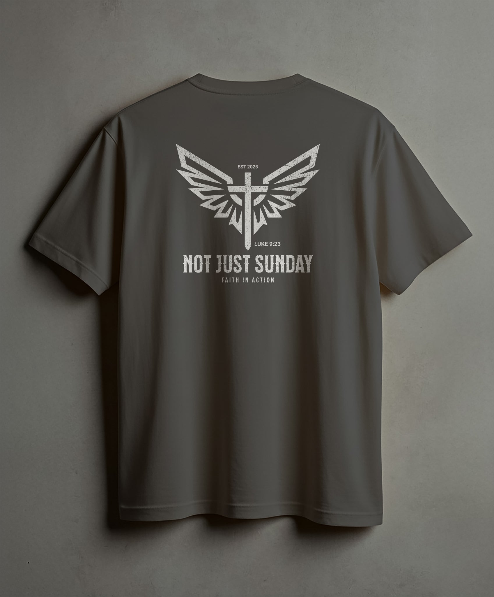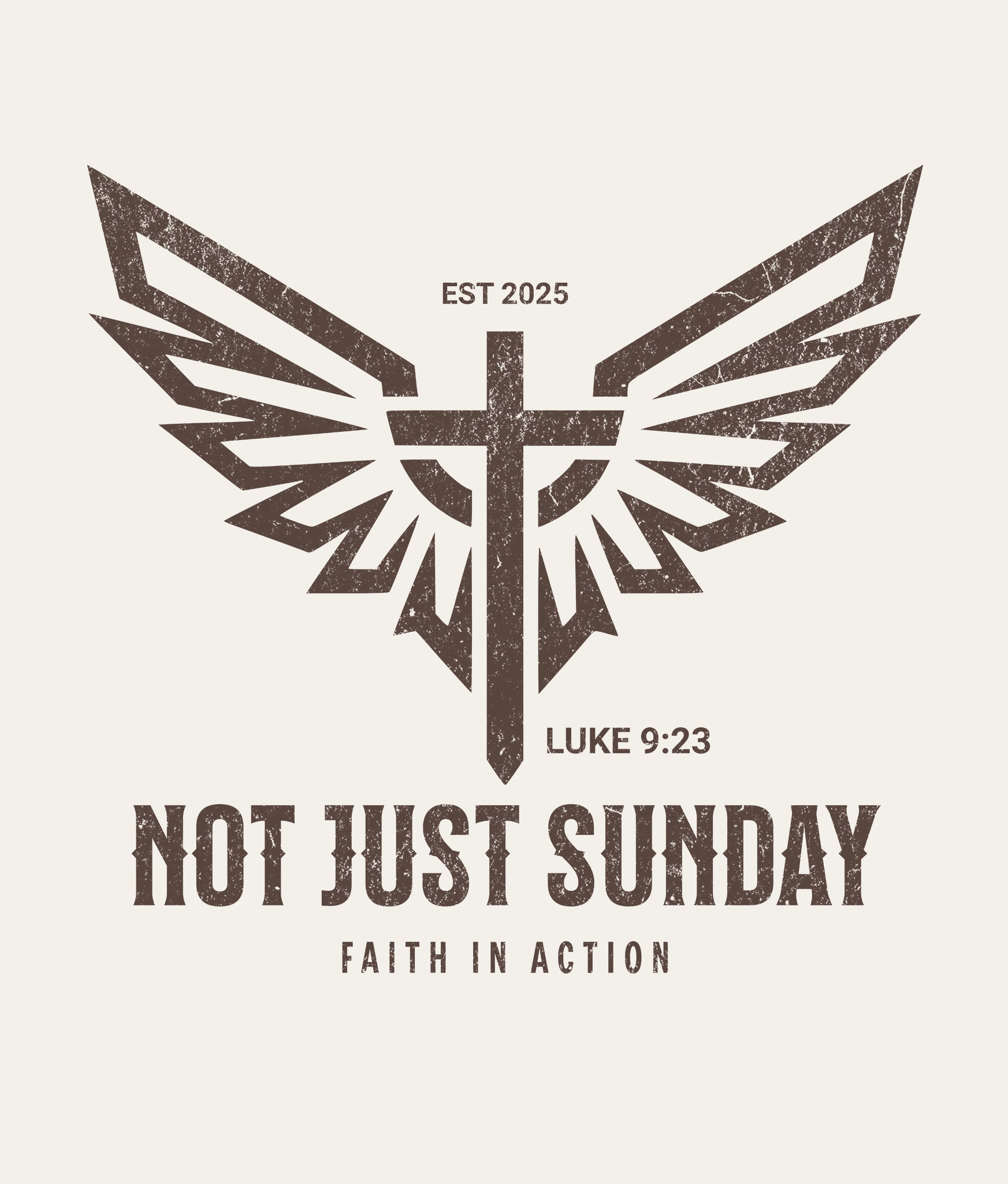 “Not Just Sunday” is more than a tee — it’s a declaration. A reminder to carry your cross daily (Luke 9:23), to live with quiet conviction, and to walk in purpose all week long.